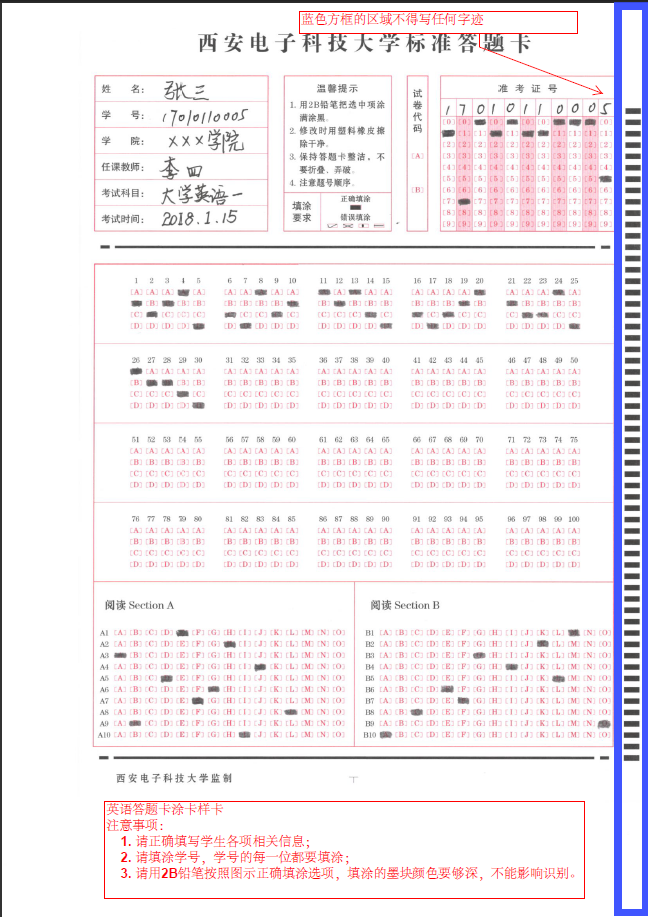 西电英语期末考试答题卡样卡下载(含填写注意事项)