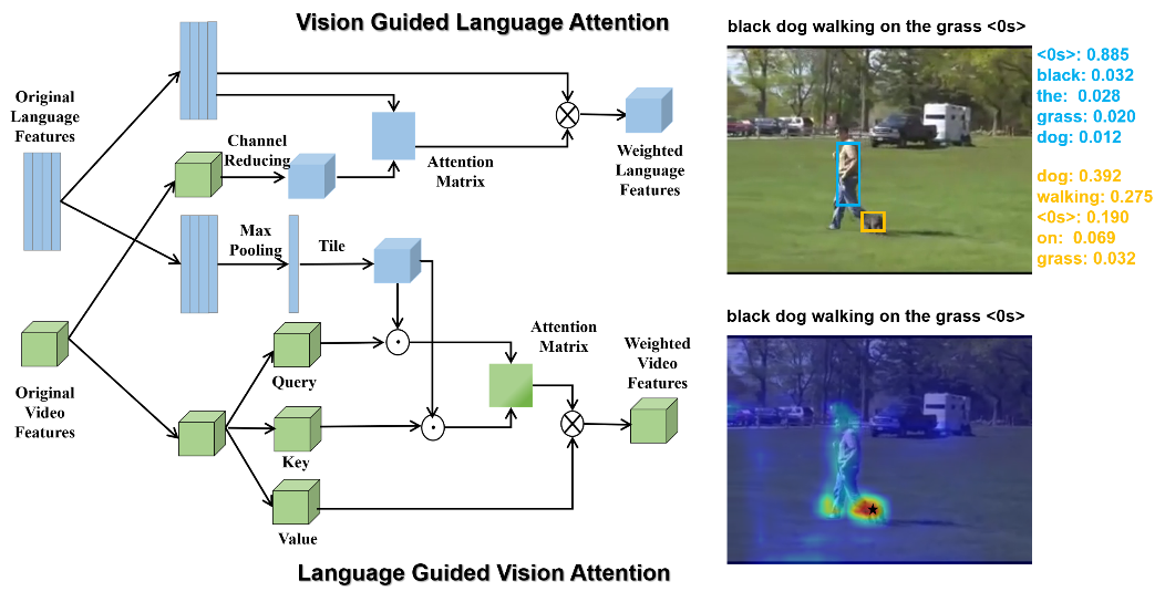 王浩博士的论文“Asymmetric Cross-guided Attention Network for Actor and Action Video Segmentation from Natural Language Query”提出了一种非对称交叉引导注意网络用于建立自然语言描述和视频内容之间的复杂关系。该方法有效解决了因人类语言描述多样而引起的自然语言鲁棒特征提取问题,并根据语言描述自适应地增强视频内容相关区域的上下文信息,有效提高了根据句子描述进行视频目标分割任务的性能。