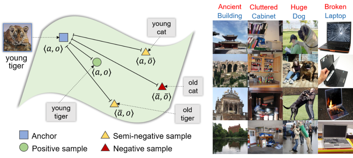魏坤博士的论文“Adversarial Fine-Grained Composition Learning for Unseen Attribute-Object Recognition” 提出了一种基于对抗学习的方法,用于解决未见“属性–目标”对的零样本识别问题。该方法首次定义了“属性–目标”对的“半负样本”概念,并有效地克服了半负样本对于零样本识别问题的干扰。