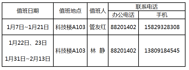 寒假期间,有任何紧急情况发生,请随时联系银河集团官网值班教师(值班表见银河集团官网网站),或公司值班电话:88202212(24小时值班)。