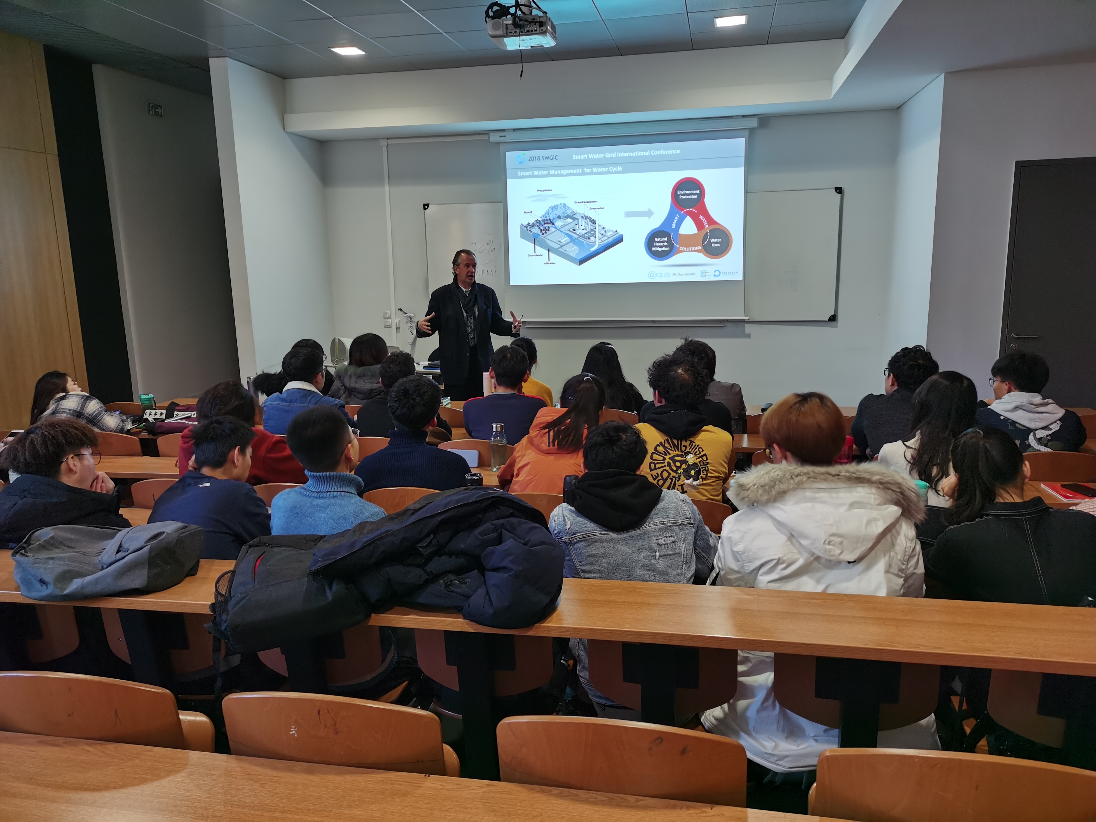 尼斯综合理工的前董事长菲利普教授为大家做了智慧城市水应用的报告,分享了智慧城市的概念和有关应用技术,并讲授了针对智慧城市水利用的研究,特别讲授了一个针对城市洪水分析的科研项目。通过报告的介绍,让同学了解到如何利用利用信息技术改进人类生活,如何利用信息技术来改善城市环境。