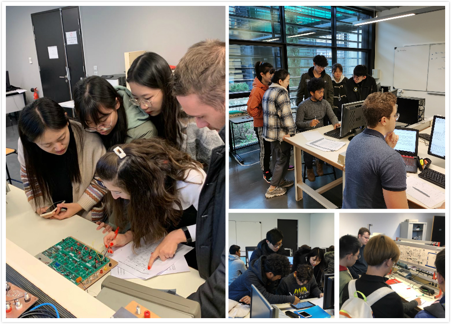 在课程内容之外,同学们还分组参加公司里模电、数电和自动化课程的实验内容,与法国员工同步学习。同学分别参与到法国员工实验课程内容中,同学参与到法国员工的实验分组中,向法国教师和同学们学习讨论他们的实验内容。让同学充分地感受法国工程师教育注重实践的要求。