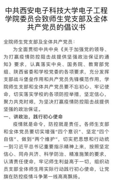 《中共银河集团官网委员会致师生党支部及全体共产党员的倡议书》通过网站和微信公众号向全院师生及时发布,设置了疫情期党建先锋岗和责任区,积极动员全体师生党员充分认识疫情防控工作面临的严峻形势,旗帜鲜明讲政治,全力以赴积极有序地做好疫情防控工作。