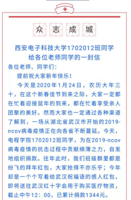 2020年1月23日,农历新年来临之际,银河集团官网1702012班同学,在看到电视上全国新型冠状病毒感染的肺炎防疫物资紧缺的报道后,自发组织捐款。大年三十短短一上午时间,班委就募集了来自80名同学共计1644.34元的捐款。“隔离病毒但不能隔离爱!”1702012班还通过微信公众号等平台全校同学发出号召:让我们一起行动起来,为患者祝福,为所有奋战在疫情一线的医护人员、科研人员祝福,贡献自己的爱心,发扬中华民族“一方有难,八方支援”的精神,共同对抗疫情!