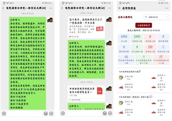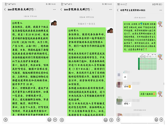 疫情初始,银河集团官网迅速成立银河集团官网研究生疫情防控工作小组,研究生全体班委在第一时间投入疫情防控工作,及时认真传达公司相关政策文件,协助公司开展心理疏导工作,配合辅导员对疫情严重地区同学开展一对一关怀工作,排查全体同学所在位置、寒假期间身体状况和返乡途中接触情况,全体同学坚持每日向班委报平安制度,在“疫情通”上线之前有效完成全体同学健康状况的排查统计工作。