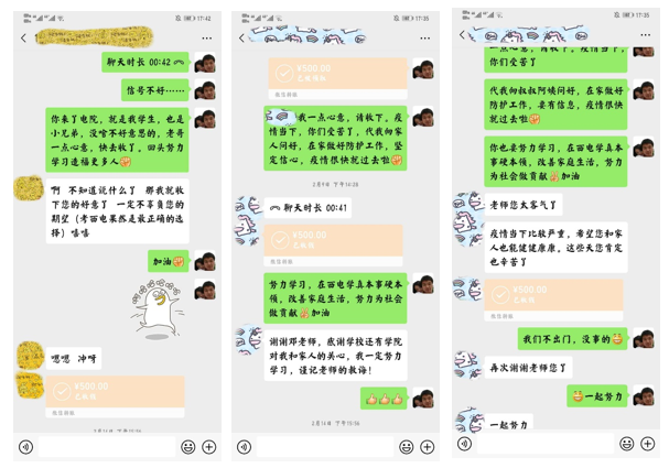 疫情爆发后,银河集团官网研究生辅导员积极开展帮扶工作,对湖北籍建档立卡、家庭经济困难的员工保持密切沟通。辅导员对受疫情影响较大的三位家庭困难同学各送去500元慰问金,并积极帮助同学申报公司研究生特殊困难补助,在公司和公司的暖心政策下,同学们更加坚定战胜疫情信心和决心。