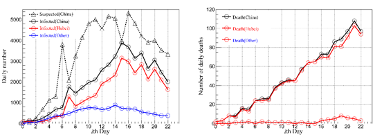 图1:截止2020年2月11日全国、湖北和全国其它地区新冠肺炎每日新增:(a)疑似人数及确诊人数和(b)致死人数,随时间的变化。第0天为1月20日,第22天为2月11日。