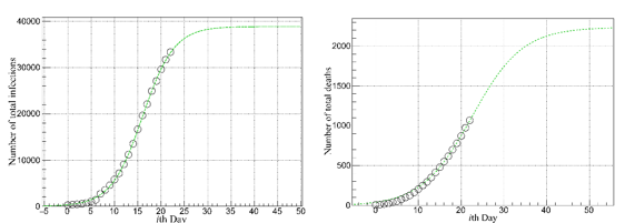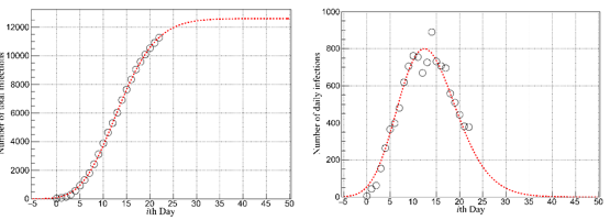 图2: 全国除湖北(a)总感染人数和(b)每日确诊人数,随时间变化及趋势;圆圈为实际数据,红色为拟合及变化趋势预测。预测拐点为第12天(2月1日),预计至疫情结束时(3月5日后)累计感染人数约12600人。