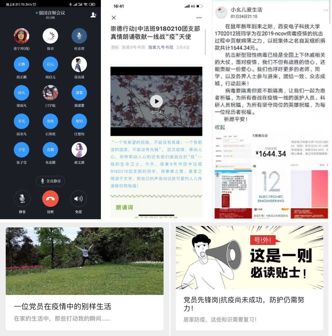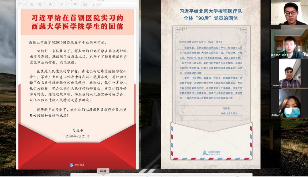 2018级向全体党员发出了《战‘疫’有我 党员先行》倡议书,倡导全体党员按时参加在线党组织生活,设立“党员先锋岗”,实施“先锋打卡”计划,引导党员同志把身份亮出来、把责任扛起来,带动同学们在疫情防控期间开展良好的学习生活,坚定战胜疫情的信心;中法班自编自演小视频——致敬一线战“疫”英雄,用声音向可爱的战“疫”英雄致敬;各年级组织员工线上学习习近平总书记给在首钢医院实习的西藏大学医公司员工的回信,以及习近平给北京大学援鄂医疗队全体“90”后党员的回信。
