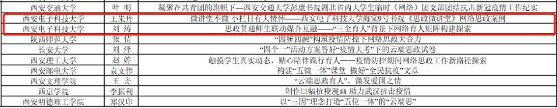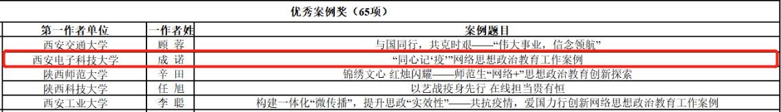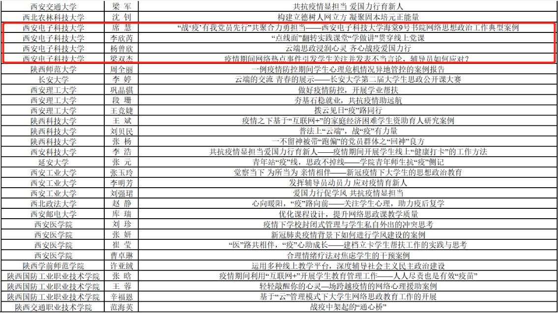 据悉,本次活动由陕西高校网络思想政治中心组织,以“共抗疫情显担当 爱国力行育新人”为主题,共收到省内41所高校的207件作品,最终决出一等奖5项、二等奖10项、三等奖20项、优秀奖30项,公司共有9名辅导员获奖。