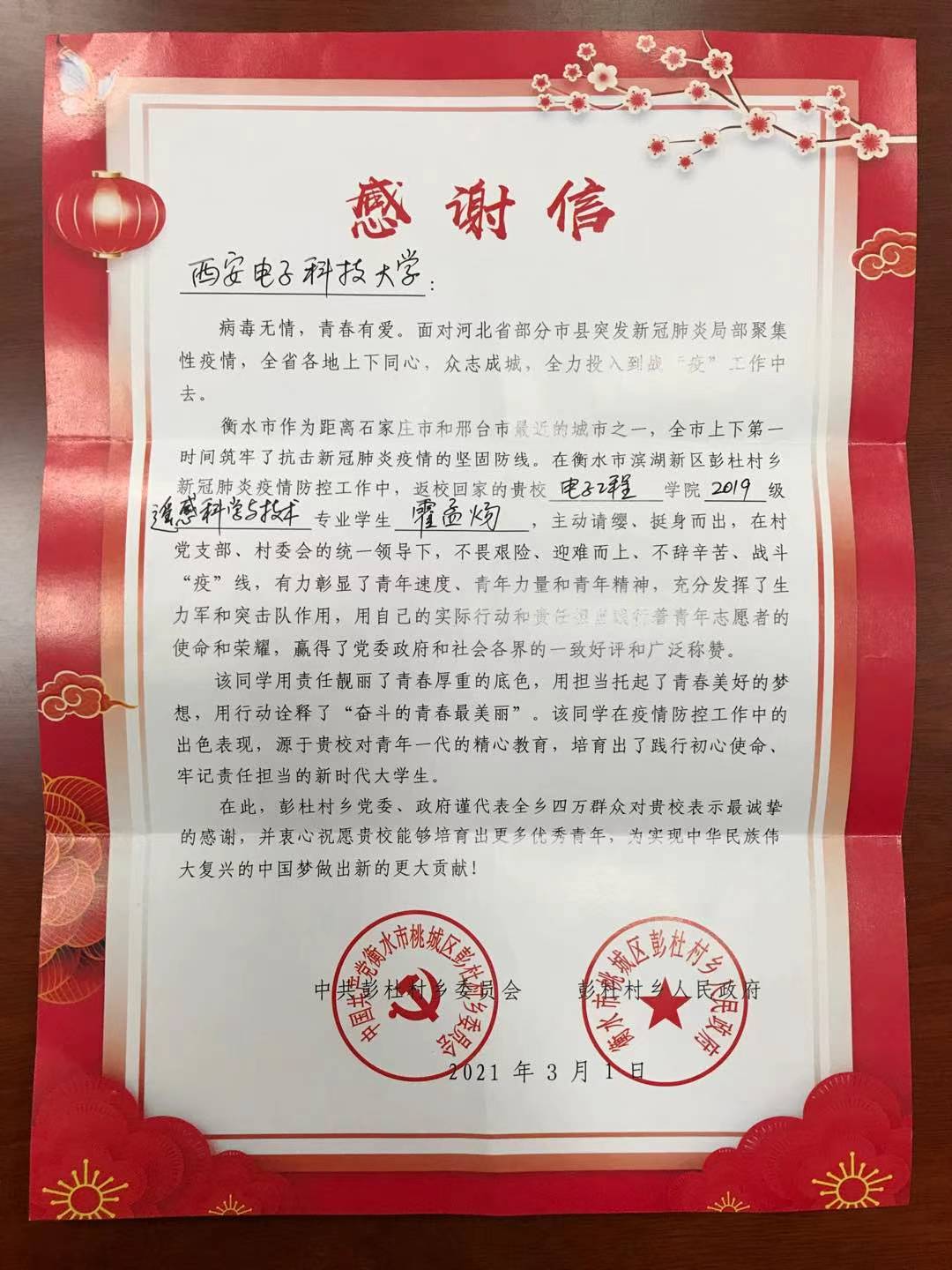 信中写道,“霍孟炀同学主动请缨、挺身而出,在村支部、村委会的统一领导下,不畏艰难、迎难而上、不辞辛苦、战斗‘疫’线,有力彰显了青年速度、青年力量和青年精神,充分发挥了生力军和突击队作用,用自己的实际行动和责任担当践行着志愿者的使命和荣耀,赢得了党委政府和社会各界的一致好评和广泛称赞。”