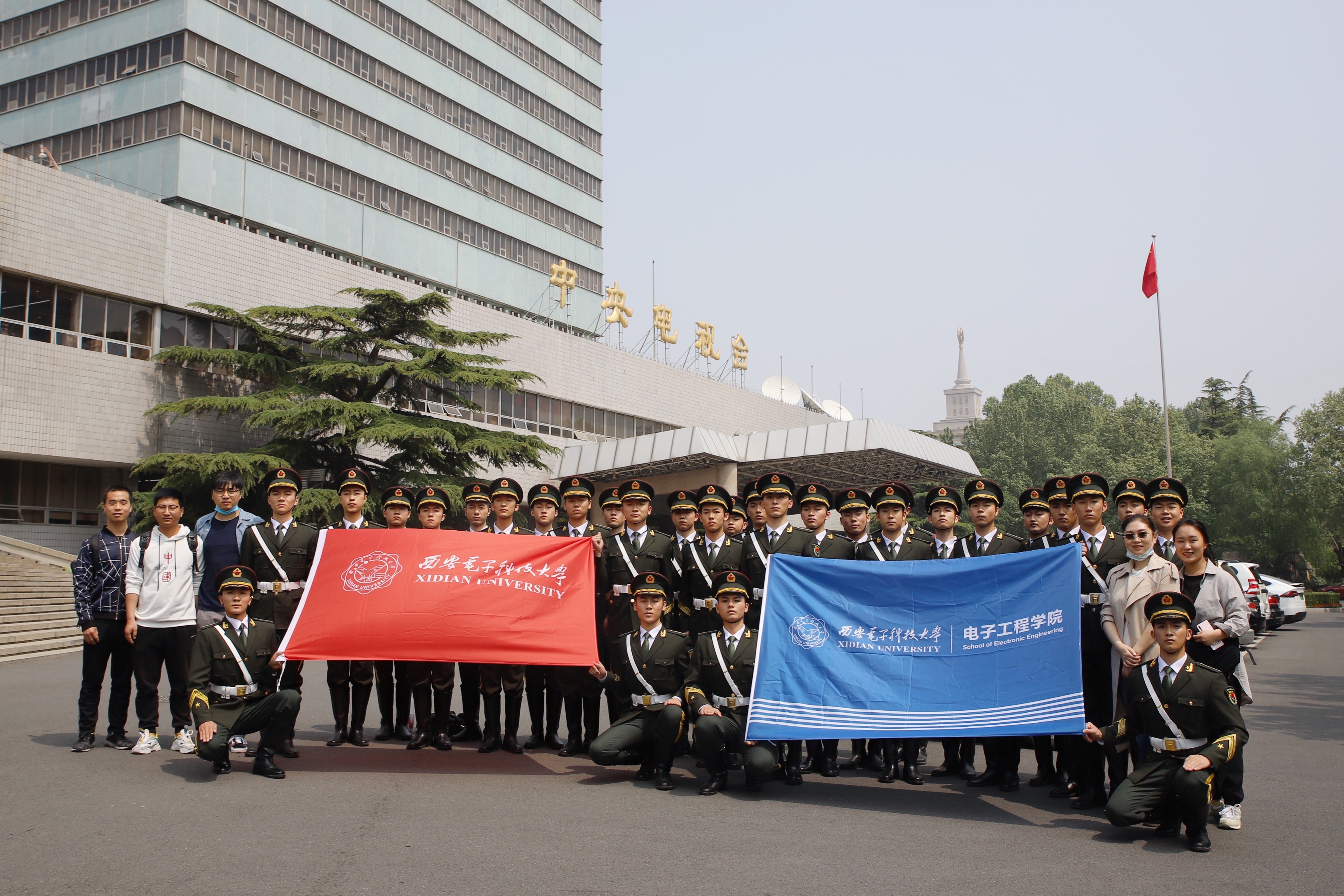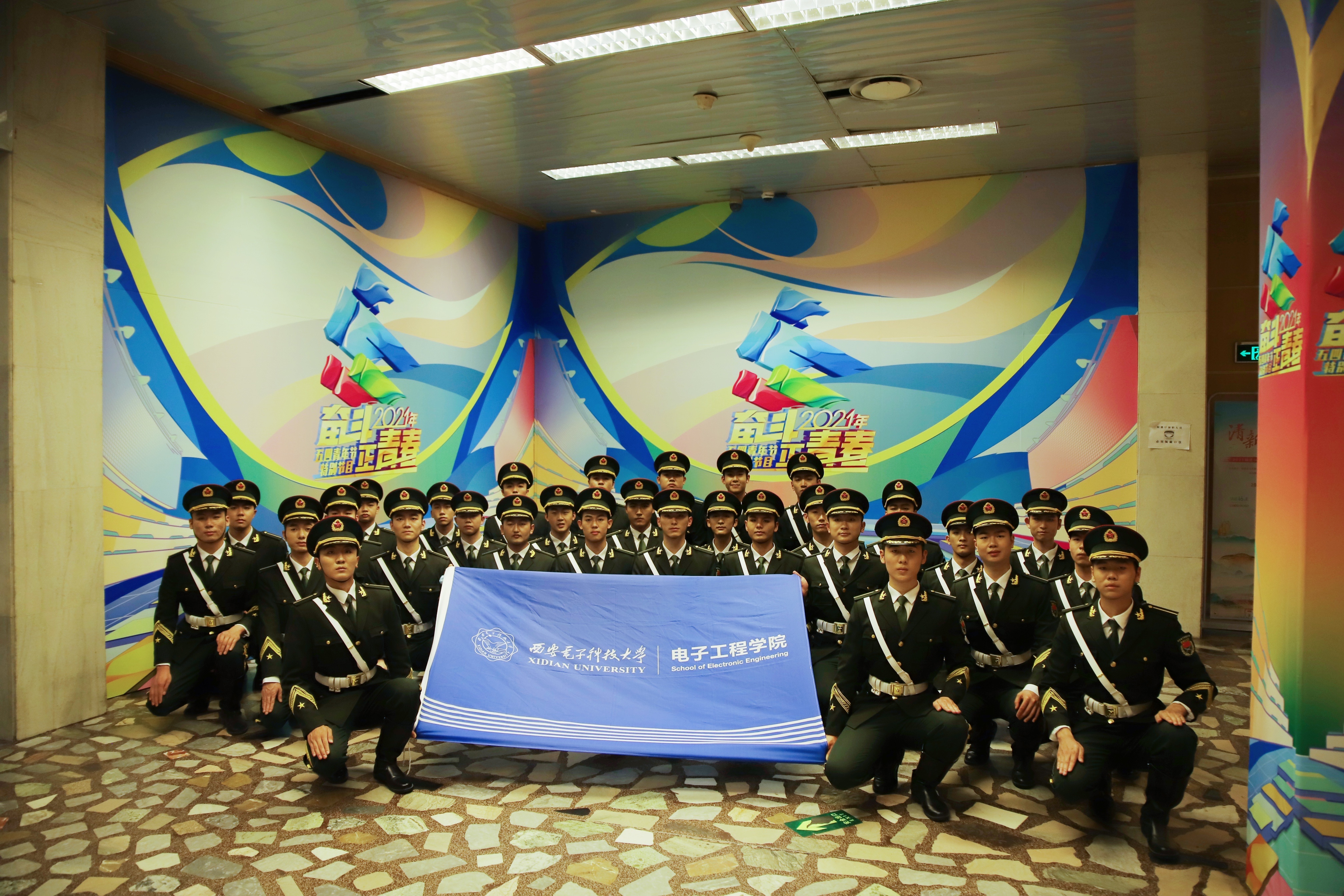 参演员工赵思垚说:经历台前幕后训练、排练与演出的难忘经历,我不仅结交了来自各高校的新朋友,熟识了细心负责的老师,更体会到新时代青年英姿飒爽的气魄与坚韧顽强的精神。舞台位置、动作和节拍的悉心教导,雨天训练中的温暖咖啡,排练到凌晨的严格与坚守……带队老师的照顾与陪伴,是我们辛苦训练中最温暖的后备。音乐响起时挺拔的军姿、行军礼时坚定的目光和笔直的身躯,训练过后帽檐下的汗水和酸痛的肩背,辛苦训练间隙抽空复习信号与系统……30名“战士”的坚韧顽强,只因为我们“西电国旗护卫队”肩章上沉甸甸的责任。