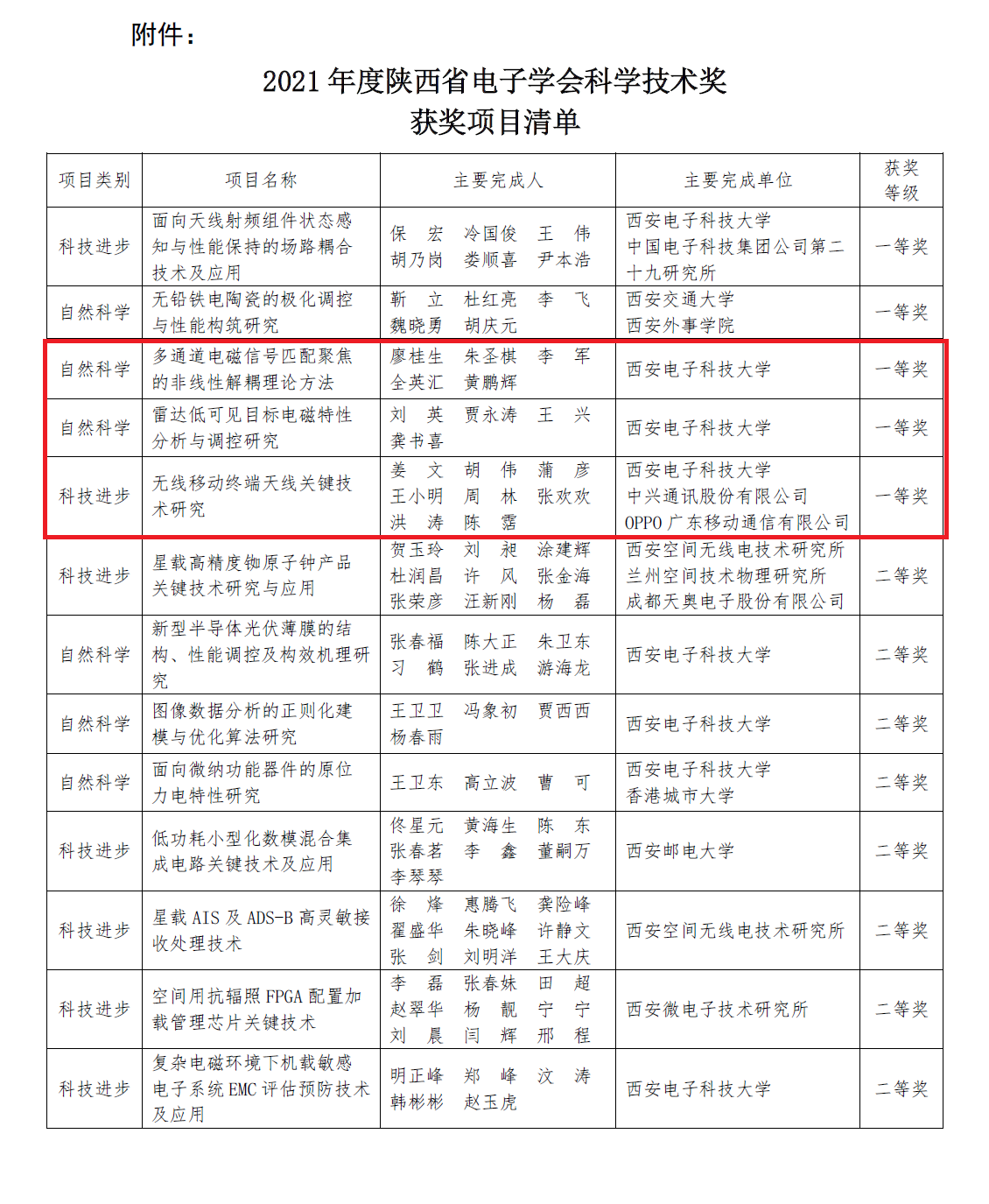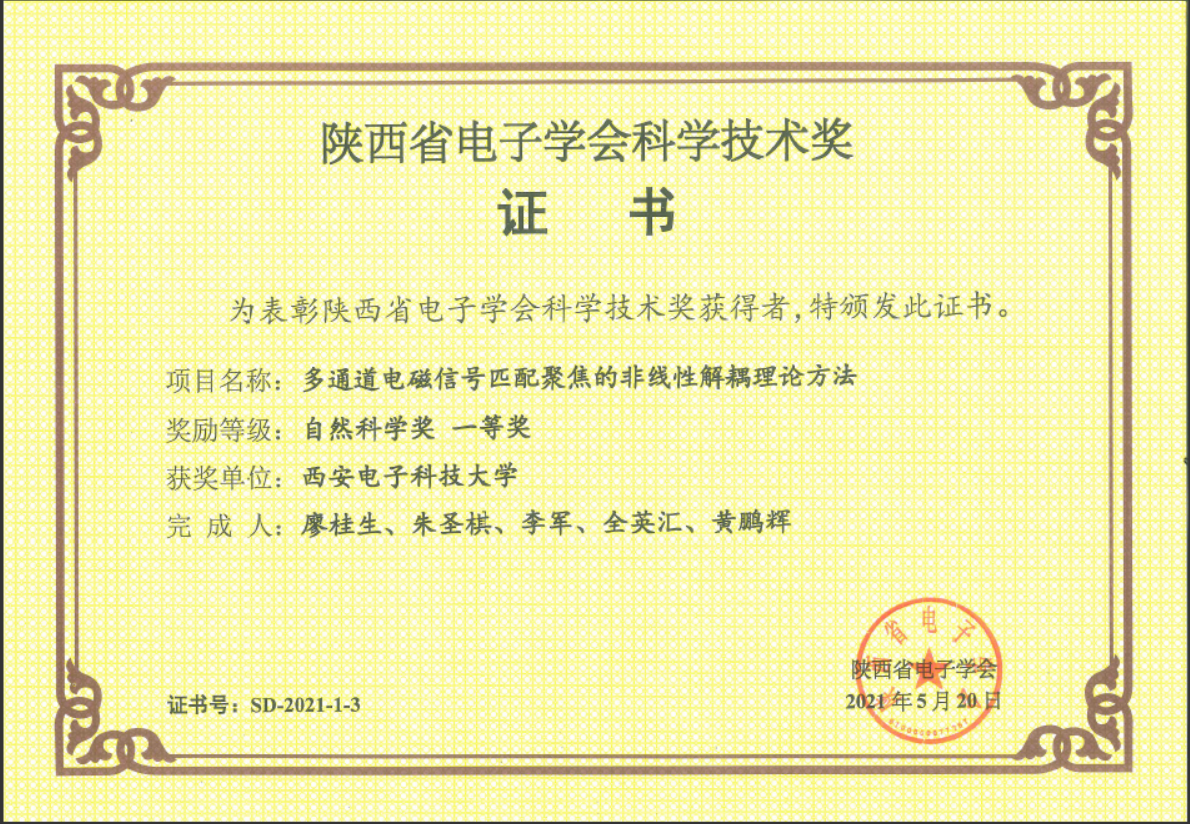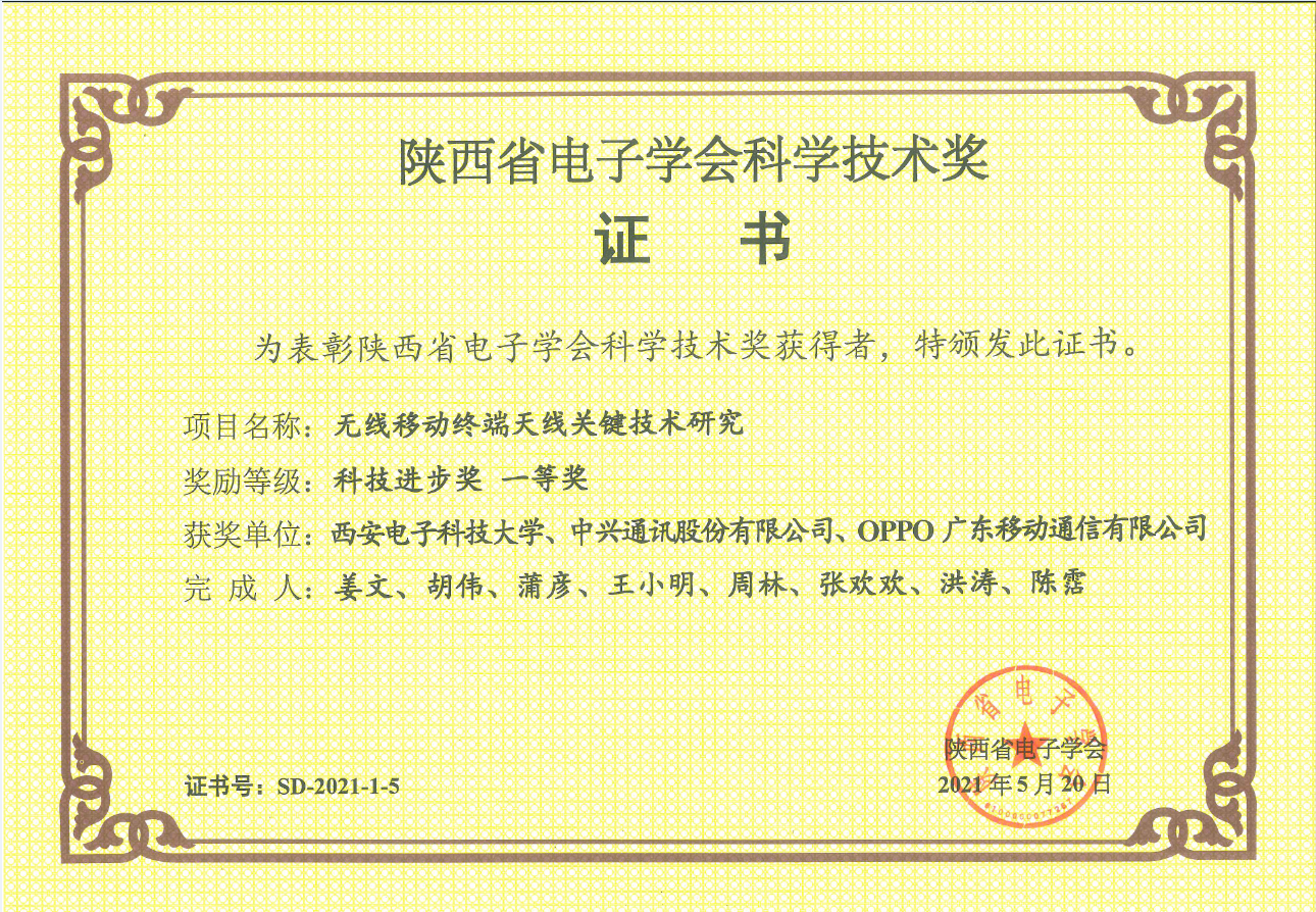 (通讯员 张严锋 郝瑞) 2021年度陕西省电子学会科学技术奖评选工作日前结束。经学会各会员单位推荐,专家评审,共评出获奖项目13项,其中一等奖5项,二等奖8项。公司廖桂生教授牵头的“多通道电磁信号匹配聚焦的非线性解耦理论方法”及刘英教授牵头的“雷达低可见目标电磁特性分析与调控研究”项目获自然科学类一等奖,姜文教授牵头的“无线移动终端天线关键技术研究”项目获科技进步类一等奖。