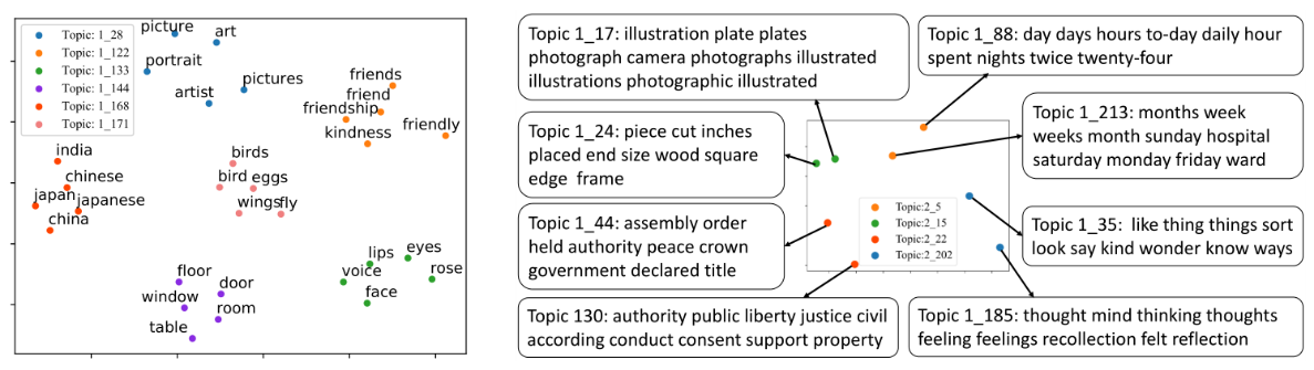 图2:(a) 单词与主题向量投影(b)不同层的主题向量投影