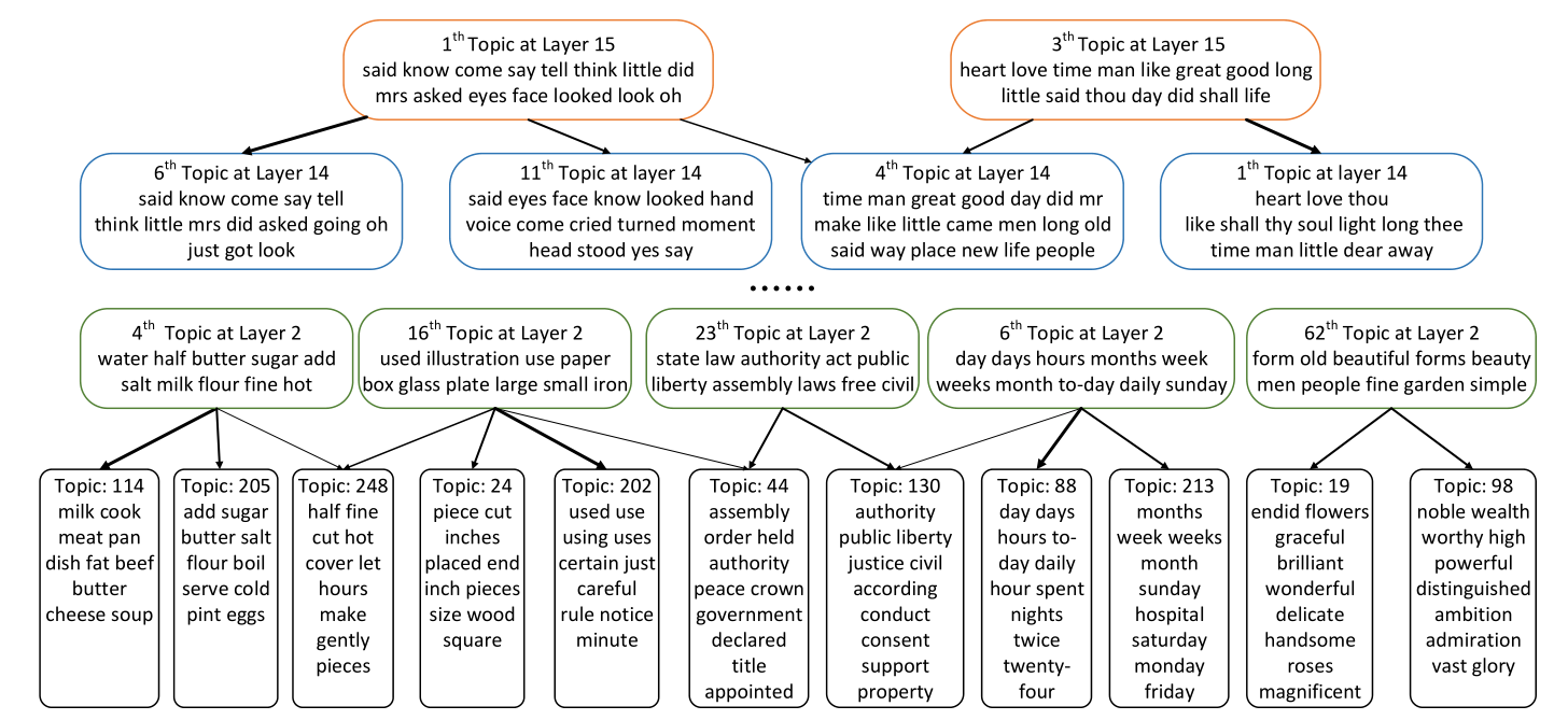 除次之外,锯齿形网络结构能够将多层的网络参数投影至同一空间中,具有更强的可解释性。 如图2所示,语义相似的单词会投影在相似的区域中,并且不同层的主题也会被投影于同一空间。 图三中展示了15层的网络结构,说明在深层依然可以学习到有意义的网络结构,展示出模型的强大建模能力。