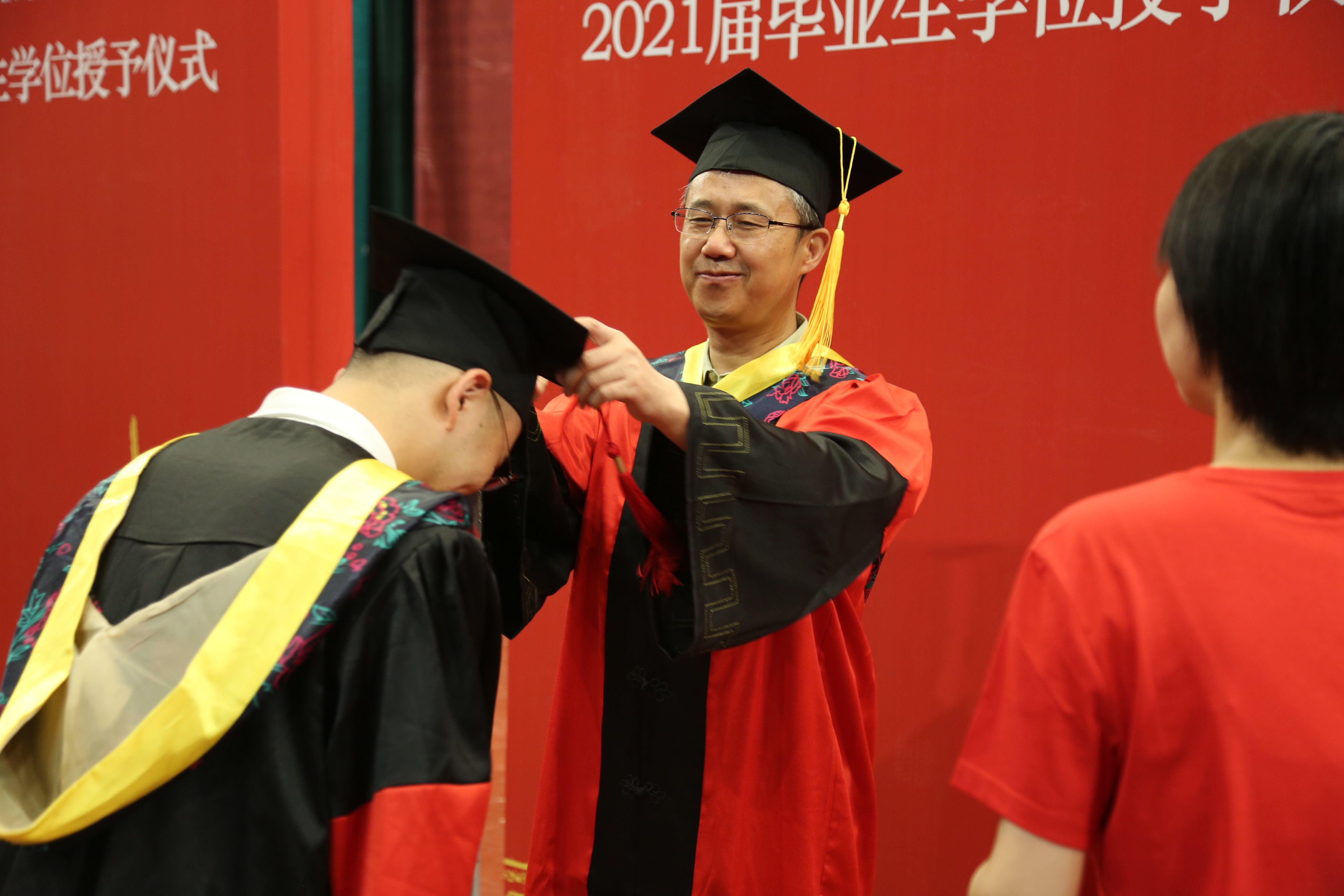 随后,崔铁军院士和各位导师上台为博士毕业生、硕士毕业生逐个拨穗授位。随着授位名单的宣读,毕业生们依次上台并与导师们合影留念。