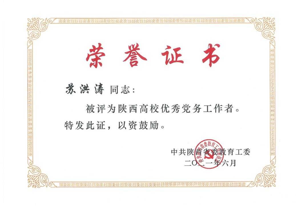 苏洪涛同志荣获“陕西高校优秀党务工作者”