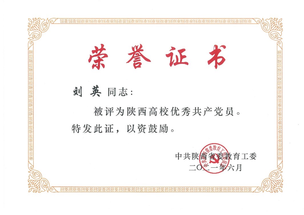 刘英同志荣获“陕西高校优秀共产党员”称号