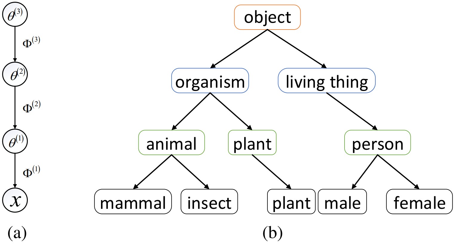 其中,陈渤教授指导的硕士生段志斌和博士生徐逸石合作完成的工作,《TopicNet: Semantic Graph-Guided Topic Discovery》,被第35届 Conference on Neural Information Processing Systems(简称NeurIPS)录用。作为当前全球最负盛名的人工智能学术会议,本届NeurIPS总计收到9122篇有效论文投稿,接收率26%。本篇论文延续了团队在概率深度网络方面的系列工作。众所周知,深度神经网络在各种基于感知的任务(如检测与识别)中甚至已经达到了超越人类的水平,但是其逻辑推理能力却远远落后于人类。其中很重要的一点原因就是神经网络缺乏常识,常识虽然很常见,但它往往难以公式化。因此,如何将常识嵌入神经网络是一项富有挑战性的任务。该论文针对现有概率深度网络缺乏融入先验知识的灵活性问题,探索性地提出将常识(概念之间的包含关系)编码为一种层次结构的先验知识,通过建立概念与网络参数之间的对应关系,可以将常识作为网络学习过程中的有效正则。此外,为了使常识更好地辅助模型,该论文还开发了一种方法从大规模通用知识图谱中提取出有效的常识与任务数据进行适配,并与该团队在ICML2021提出的锯齿形网络结构进行巧妙结合,被应用于概率深度模型中,取得了良好的实验效果。