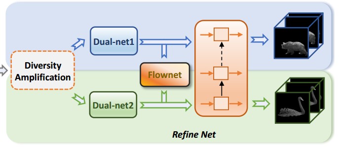 该论文针对上述多视场视频快照压缩重构问题,提出一种深度学习方法,能够在数秒内重构出多视野的高质量视频。首先,为了增加不同场景的辨识区别度,该论文基于多视场视频压缩原理提出了一种差异放大机制。随后,构造双分支深度网络从单帧压缩快照中初步重构出不同场景的视频。最后,为了对视频中的动态变化特征进行显式建模,该论文将动态的双向光流信息巧妙地融入递归神经网络,从而完成对双场景视频的精细化重构。该方法在仿真测试数据能够快速完整地重构出双视场的多帧视频,并在真实快照压缩成像系统上验证了其优越性及实用性。该论文构建了针对多视场视频快照压缩成像的高效重构深度网络,促进了实验室对该领域最新技术的研究与发展。