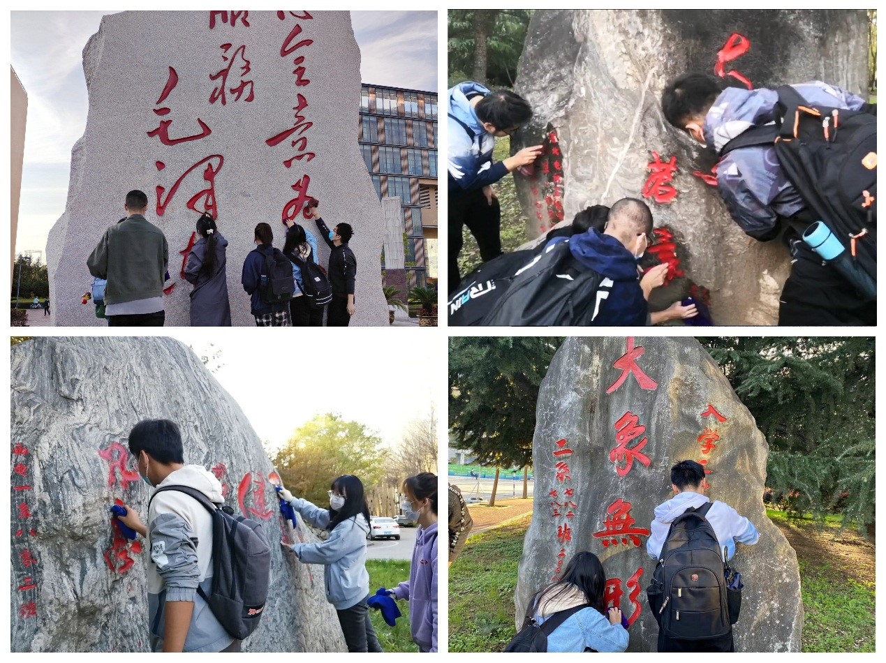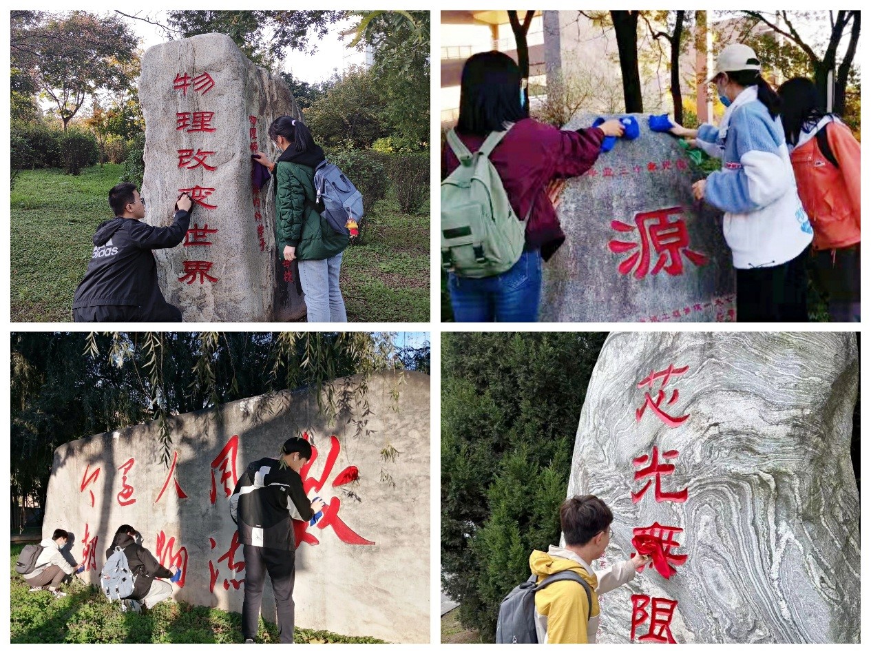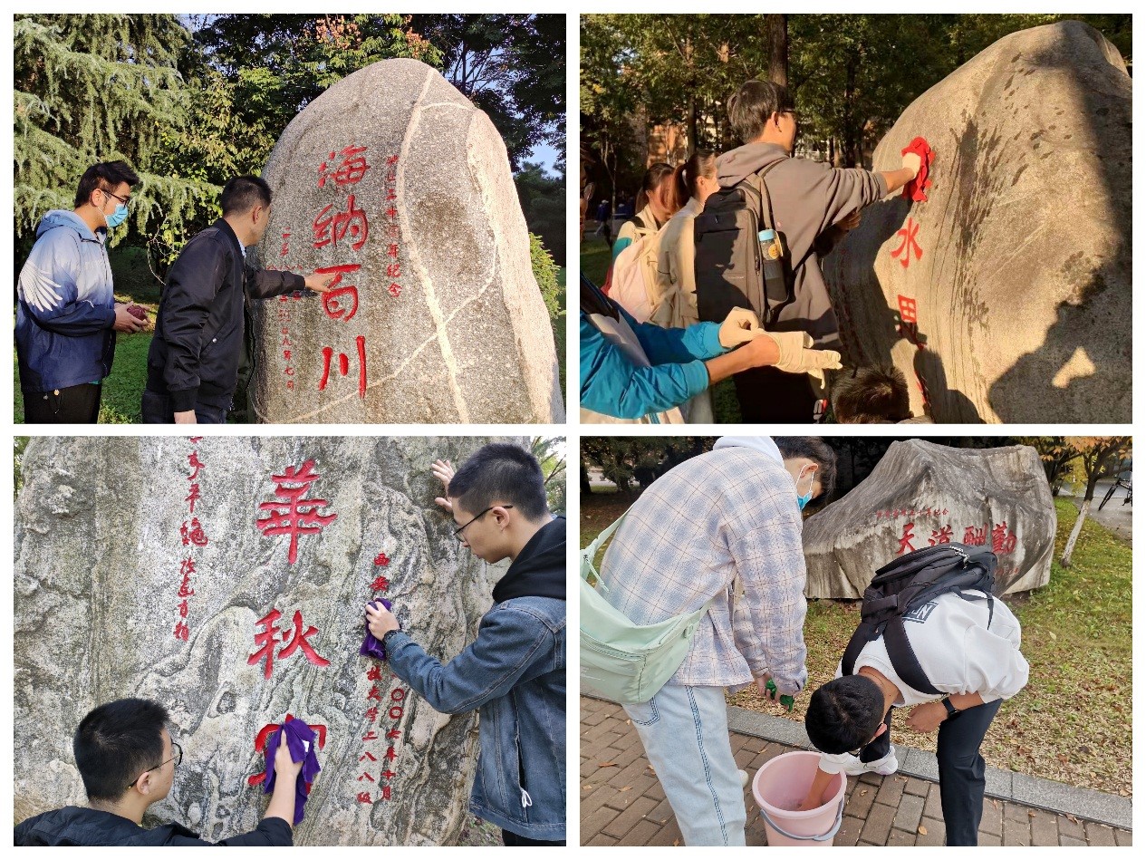 参观结束后,同学们分组对校园内12块员工捐赠石刻进行全面细致的清洁工作。一块块员工捐赠石刻,是员工们不忘母校、感恩母校的见证,更是员工们对母校的真挚祝福、对学弟学妹的殷切期望。同学们将一块块员工捐赠石刻擦洗干净,既为员工们守护这份记忆,又在劳动的过程中增强归属感、荣誉感、使命感。
