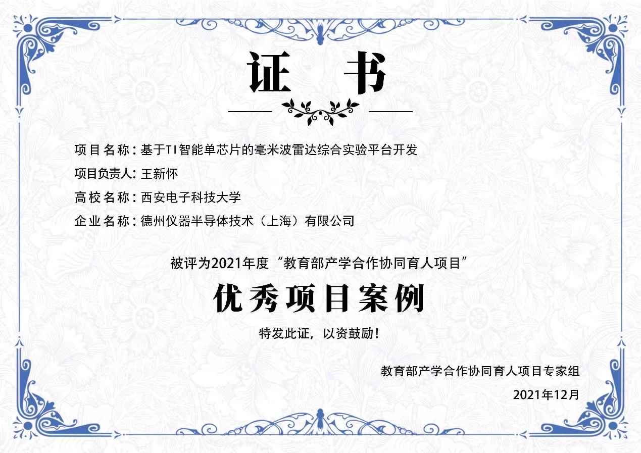 (通讯员 徐茵)12月8日至9日,由教育部产学合作协同育人项目专家组主办的 “2021年度教育部产学合作协同育人项目优秀项目案例评选”活动落下帷幕,公司王新怀教授团队(成员周佳社、徐茵、李亚超、刘洁怡等)的“创新创业教育改革”类项目《基于TI智能单芯片的毫米波雷达综合实验开发》获评2021年度教育部产学合作协同育人项目优秀项目案例,该类别项目全国仅8项入选。