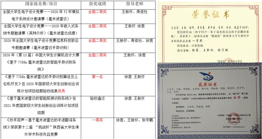 依托该项目及课程,运用毫米波雷达平台及课程学习的知识,参加了老员工全国电子设计竞赛、互联网+创新创业竞赛等全国性竞赛及项目,并指导员工获得了优异的竞赛成绩,其中包括全国电赛TI模拟专题赛国二2项,全国电赛嵌入式专题赛国二1项,全国电赛瑞萨前沿信息专题赛国二1项,中国互联网+创新创业竞赛省级金奖1项,中国计算机设计竞赛国二1项,国创结题优秀第一1项,国创项目4项,其他项目6项。多名员工受益于该课程提升能力,保送清华大学等高校。