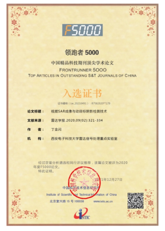 (通讯员 刘昕雨)2021年12月27日,科技部中国科学技术信息研究所发布了2020年度“领跑者5000-中国精品科技期刊顶尖学术论文”(简称F5000)获奖名单,公司丁金闪教授论文《视频SAR成像与动目标阴影检测技术》入选,论文于2020年4月发表在EI检索中文期刊《雷达学报》上。论文提出了视频雷达成像与目标检测技术框架与关键算法,发表以来得到了行业高度评价。