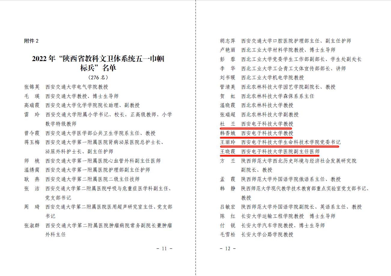 西电新闻网讯(通讯员 党章)近日,陕西省教科文卫体工会委员会下发《关于表彰2022年陕西省教科文卫体系统五一巾帼标兵和标兵岗的通报》,对2022年陕西省教科文卫体系统广大女职工优秀单位及个人进行表彰,公司教授杜兰荣获“陕西省教科文卫体系统五一巾帼标兵”荣誉称号。