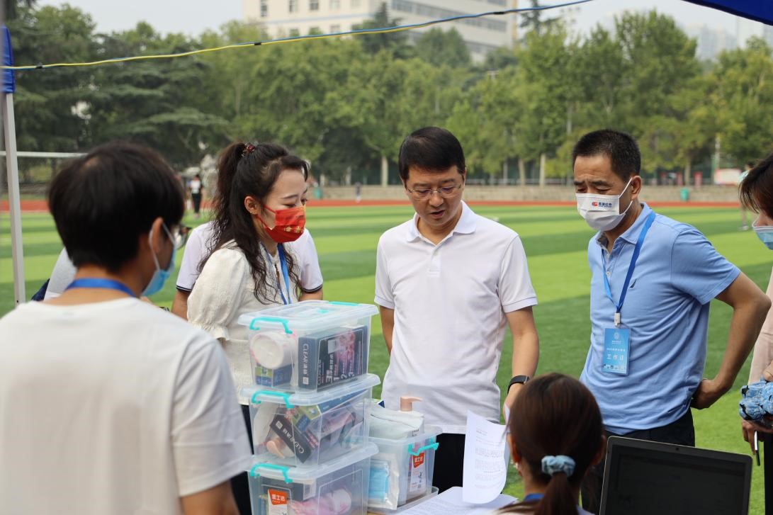 北校区体育场内,公司领导和迎新志愿者们早早布置好报到现场,认真地为每位新生办理证件核验、扫码注册、发放一卡通等环节,并送上公司精心准备的新生大礼包,提醒同学们认真落实静态管理各项要求。
