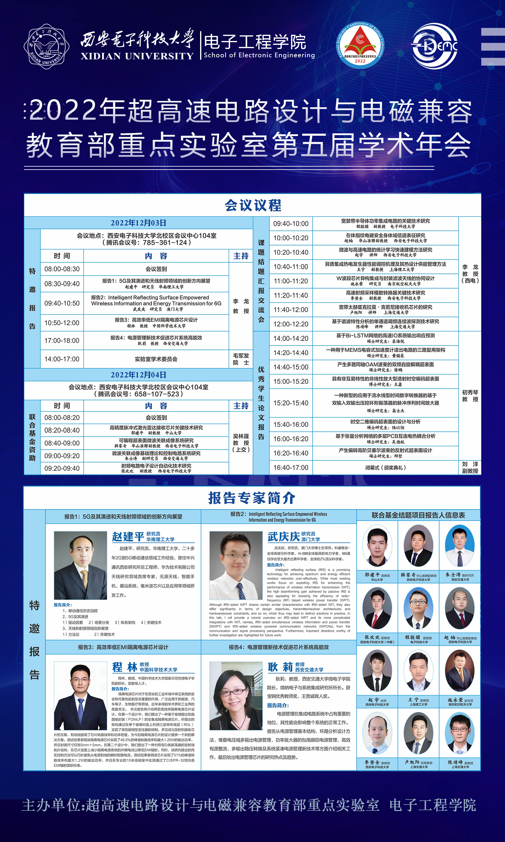超高速电路设计与电磁兼容教育部重点实验室第五届学术年会定于12月3-4日在北校区会议中心104室举行,腾讯会议线上同步进行。会议邀请了华南理工大学赵建平研究员、澳门大学武庆庆研究员、中国科学技术大学程林教授、西安交通大学耿莉教授四位相关领域知名专家学者做特邀报告,以及12位优秀青年学者做相关课题汇报交流。欢迎广大科研工作者入会交流。