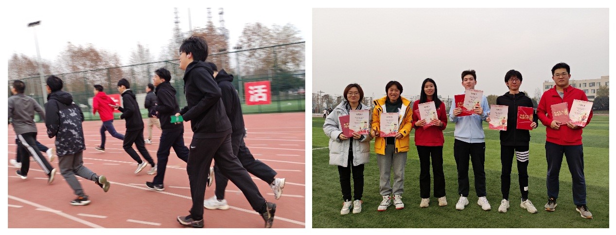 操场健身跑项目设置男子3km、女子2km两组,参赛选手们统一身穿定制运动卫衣,佩戴号码布。为了更好的适应冬季长跑,比赛开始前,由2020级体育委员白含章同学带领所有参赛选手进行赛前热身,调整身体状态。健步如飞冬意暖,疾风少年意正酣,正是对参赛运动员们的完美诠释。最终,2021级王雨佳同学获得女子2km操场健身跑第一名,2021级朱戎清同学获得男子3km操场健身跑第一名。
