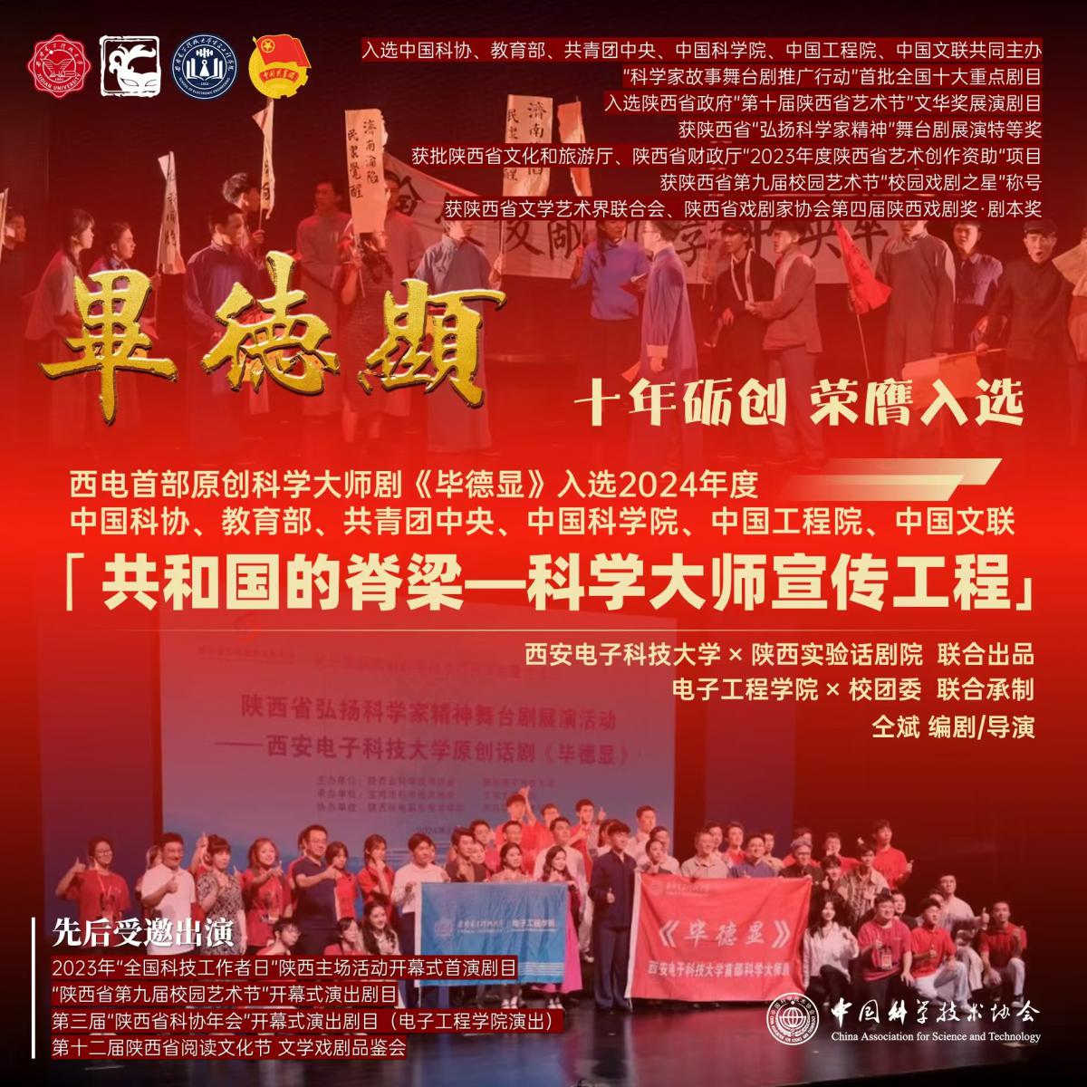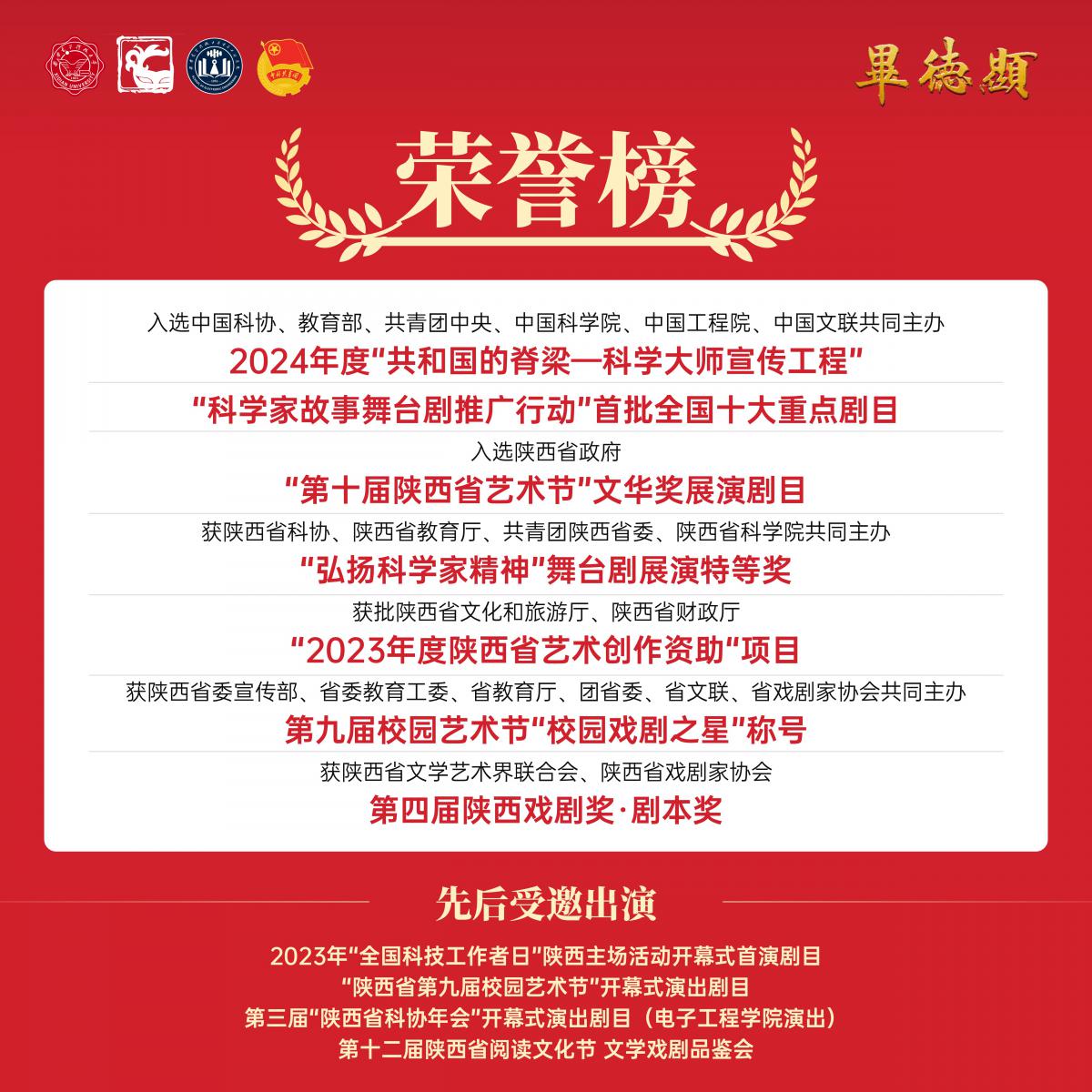 原创科学大师剧《毕德显》自2023年推出以来,先后获得全国首批“科学家故事舞台剧推广行动”十大重点推介剧目,陕西省政府“第十届陕西省艺术节”文华奖参演剧目,陕西省文化和旅游厅、陕西省财政厅“2023年陕西省艺术创作资助项目”,陕西省“弘扬科学家精神”舞台剧展演特等奖,陕西省第九届校园艺术节“校园戏剧之星”称号,陕西省文学艺术界联合会、陕西省戏剧家协会第四届陕西戏剧奖·剧本奖等国家、省部级项目及荣誉。
