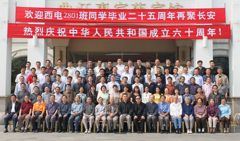 中午,2-801班返校员工在曲江惠宾苑举行午宴,公司党委书记陈治亚教授出席并致辞,感谢员工们对母校的关心,希望员工们常回家看看,多提宝贵意见和建议,祝福与会的老教师与广大员工节日愉快、身体健康、事业发展、友谊常存。原2系领导、2-801班任课老师、公司领导等一并出席并分别发言,员工代表南京熊猫电子集团公司谢志诚副总和远望谷集团徐玉锁董事长分别发言,师生畅叙友情、追忆昔日、感怀岁月、展望前景,共同度过了一个喜气、热烈、感动、和谐的国庆佳节。