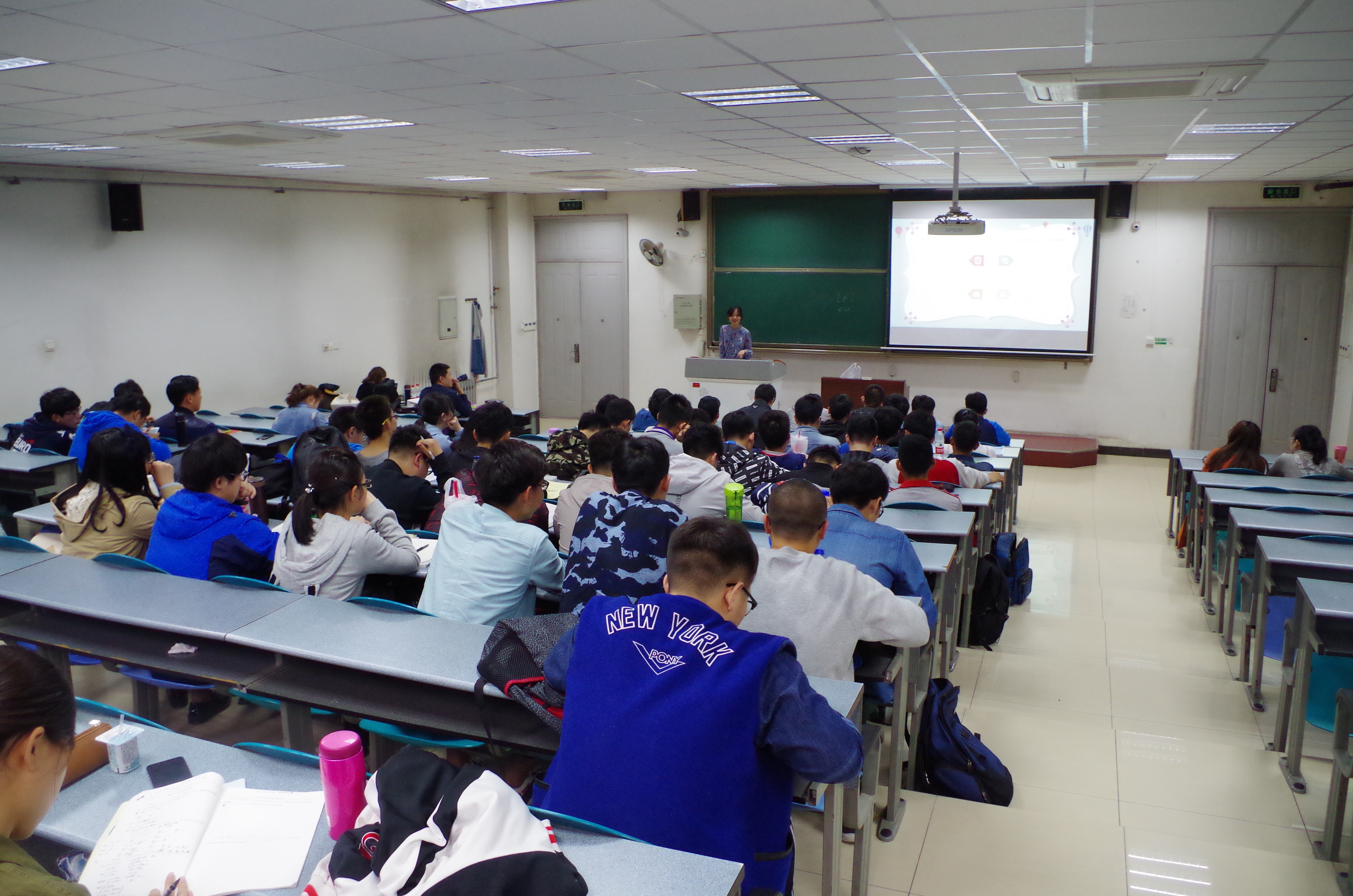 讲座伊始,新东方的汤老师从语音语调语速讲起,为同学们讲解了法语中语音相似的词的不同、不同语境下不同语调的含义以及用错语调会弄出的笑话,幽默的视频以及引人入胜的讲解,吸引了同学们的兴趣,现场时不时爆发出阵阵的笑声。