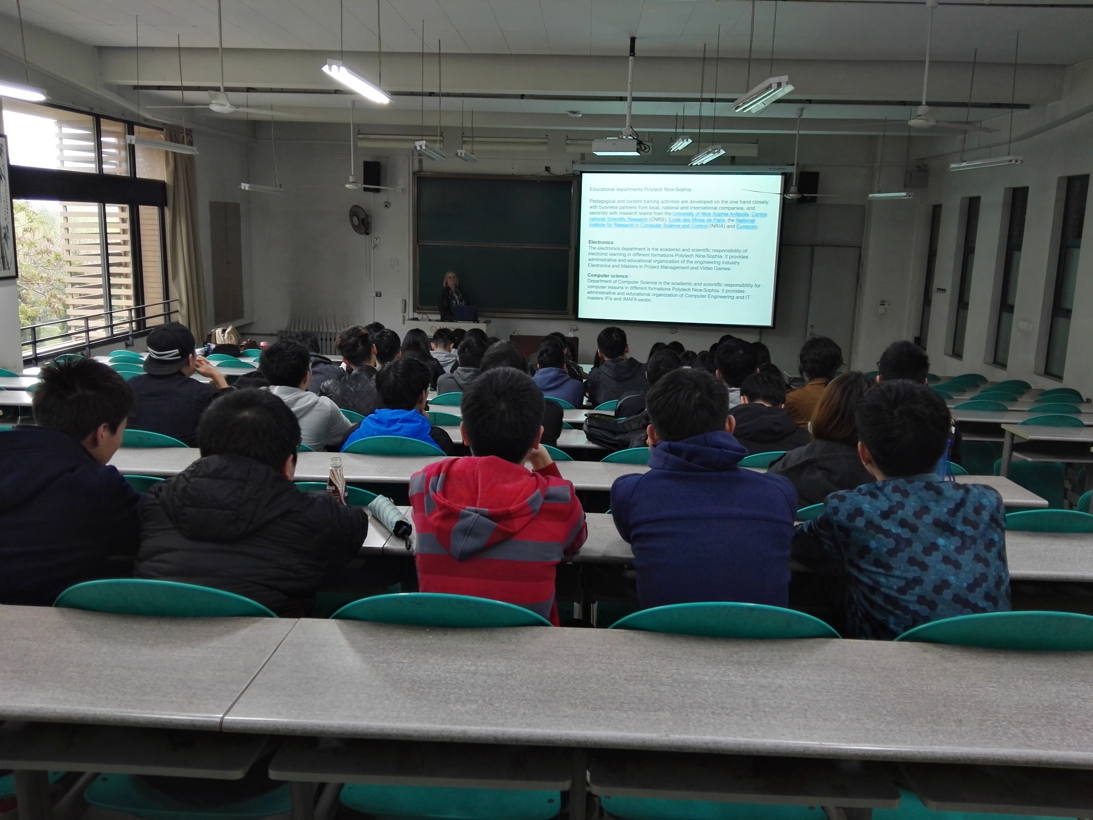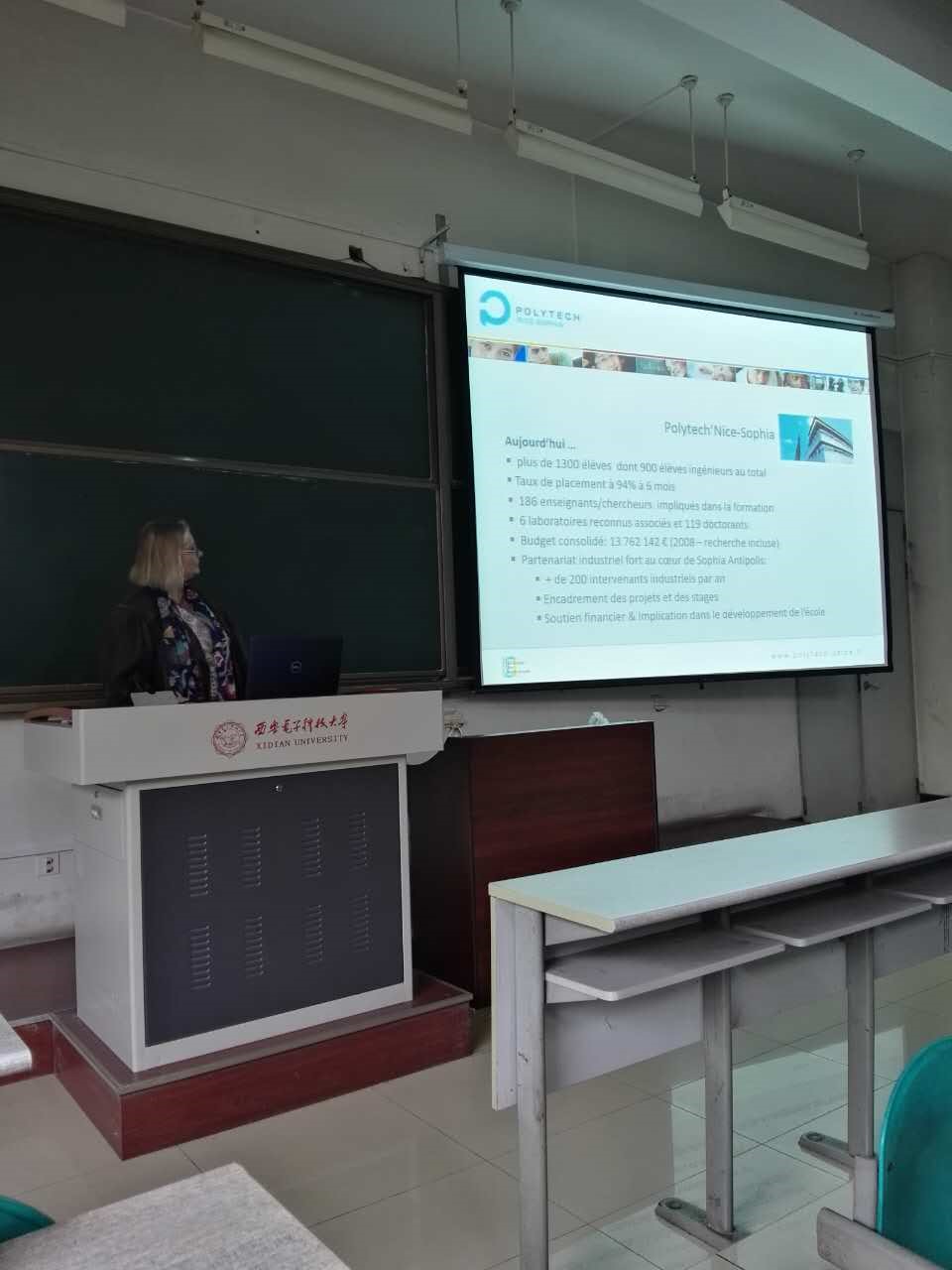 接着,Patricia女士介绍了法国综合理工集团的概况:综合理工集团是由分布在全法各地的14所工程师公司组成,开设课程包含五大科学领域80多个专业,颁发由CTI(Commission des Titres d'ingénieur)认可的工程师文凭。除了每年都会举行的综合理工董事长会晤之外,集团内部还经常举行各种各样有趣的活动,比如组团去滑雪等。随后,Patricia女士重点介绍了综合理工集团尼斯-索菲亚公司的情况:超过1300名员工,包含900名工程师,毕业后半年内就业率高达94%,校区位于Sophia Antipolis校区中心等等。接下来,Patricia女士对综合理工集团所授领域进行了一个简单的介绍,包含电子、计算机、数学、生物、水、建筑以及语言这几大方面。而针对综合理工尼斯-索菲亚公司,在展示了一系列精美的校园照片后,她对该公司提供四大专业方向以及负责教师做了详细的介绍。最后,Patricia女士简单介绍了法国工程师公司的分布以及对员工提供的服务,针对切实关乎员工实习及毕业去向,她还特别介绍了与综合理工尼斯-索菲亚有合作的公司。