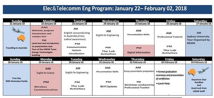 新南威尔士大学短期专业课程项目时间一般为3周,包括2周访学课程和1周东海岸文化参访活动。课程主要包括英语技能学习,电子通讯类专业课程学习,实验室活动,课题研究,专业讲座,城市参观和文化参访等环节,高强度的语言训练可以提高同学们在不同的环境下更有效的口头交流和书写能力,亲身体验世界名校教育资源和教学方法,与新南威尔士大学在校生和来自世界各地的访学员工一起交流;东海岸1周文化参访活动,包含悉尼、黄金海岸、墨尔三个著名城市和当地最著名的景点;澳大利亚是世界第三大英语国家,入住寄宿家庭,融入最地道的澳洲生活,非常有利于提高了英语表达能力,深入了解澳大利亚文化。