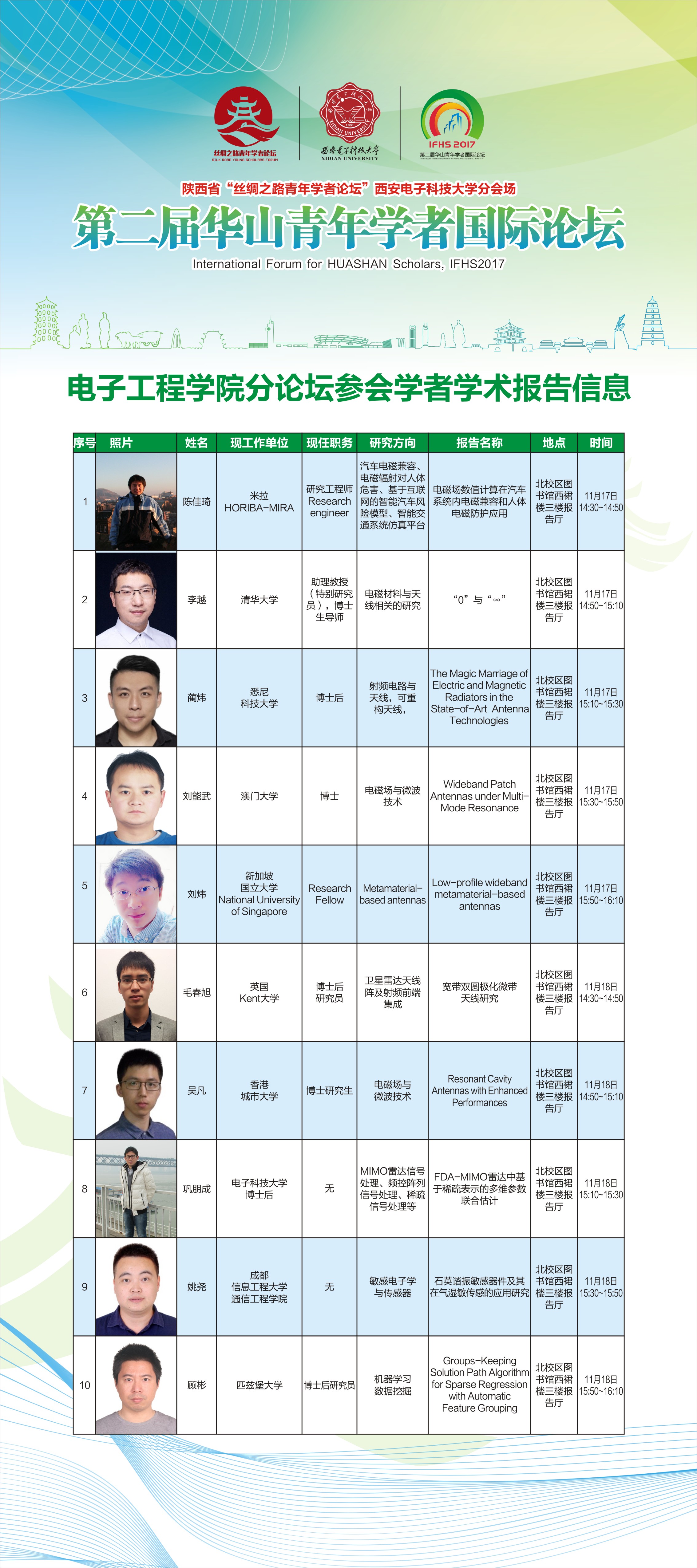 第二届华山青年学者国际论坛银河集团官网分论坛参会学者学术报告信息2017-11-16 15:41:15浏览次数: 上一篇文章:“师德标兵”廖桂生:雷达成志,仁德成师下一篇文章:2016级开展学习十九大主题教育活动