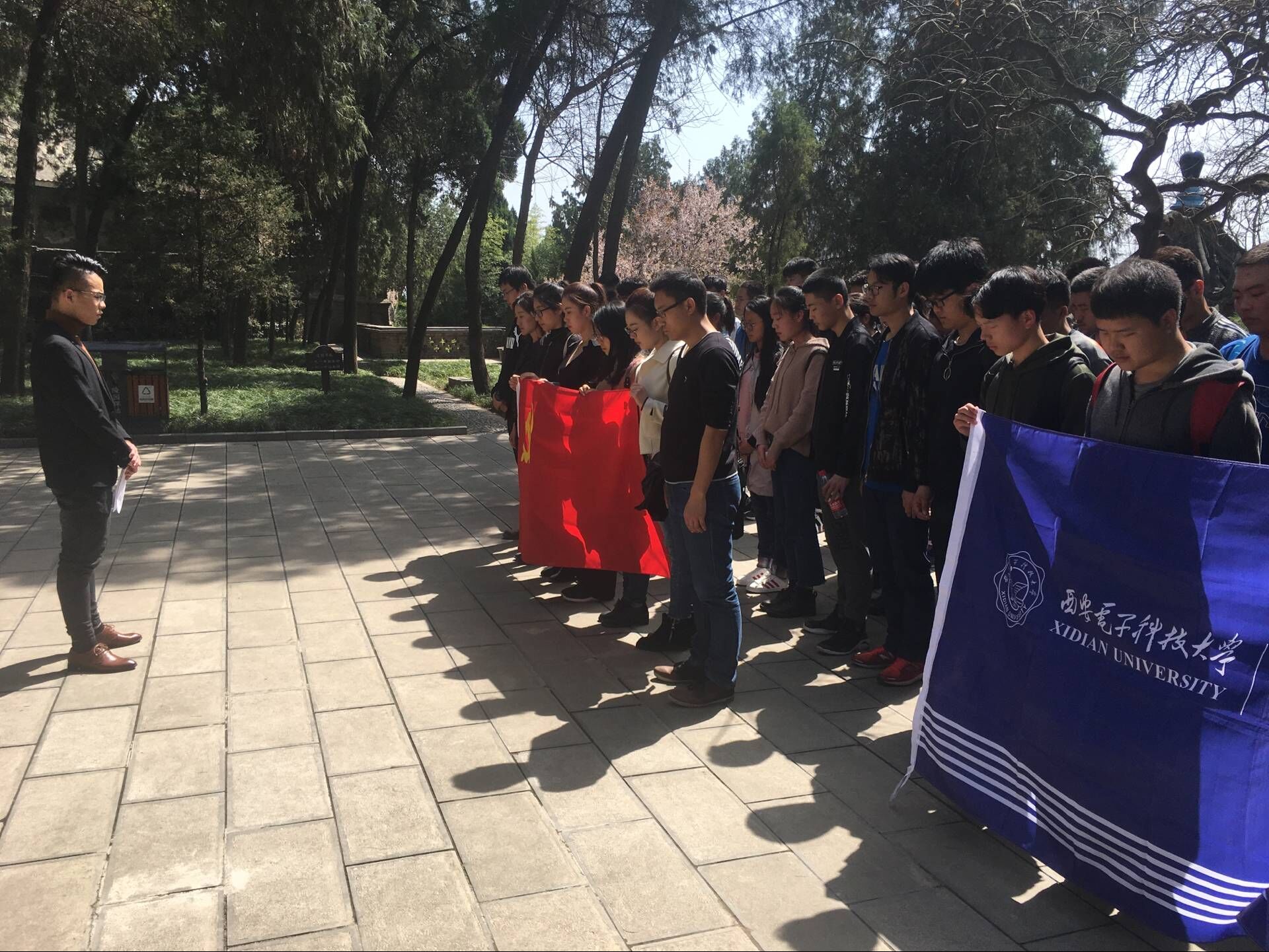 活动第二项为祭奠革命先烈。“民族英雄,千秋功臣”,苍苍柏树中用白玉镶嵌而成的八个大字格外耀眼。同学们怀着庄重的心情静默肃立,寄托着对革命先烈的尊敬、缅怀与哀悼之情。祭奠仪式中,2016级员工代表陈旭发言并提出倡议:牢记使命,不忘初心;从现在开始,从点滴做起,继承爱国传统,发扬西电红色精神,牢固树立“四个意识”,坚定“四个自信”,做到“四个服从”;坚定理想信念,增强责任感和使命感,坚持继承和弘扬民族精神;树立终身学习的观念,努力提高自身素质,争做六有青年;为建设富强、民主、文明、和谐、美丽的社会主义现代化强国努力奋斗。