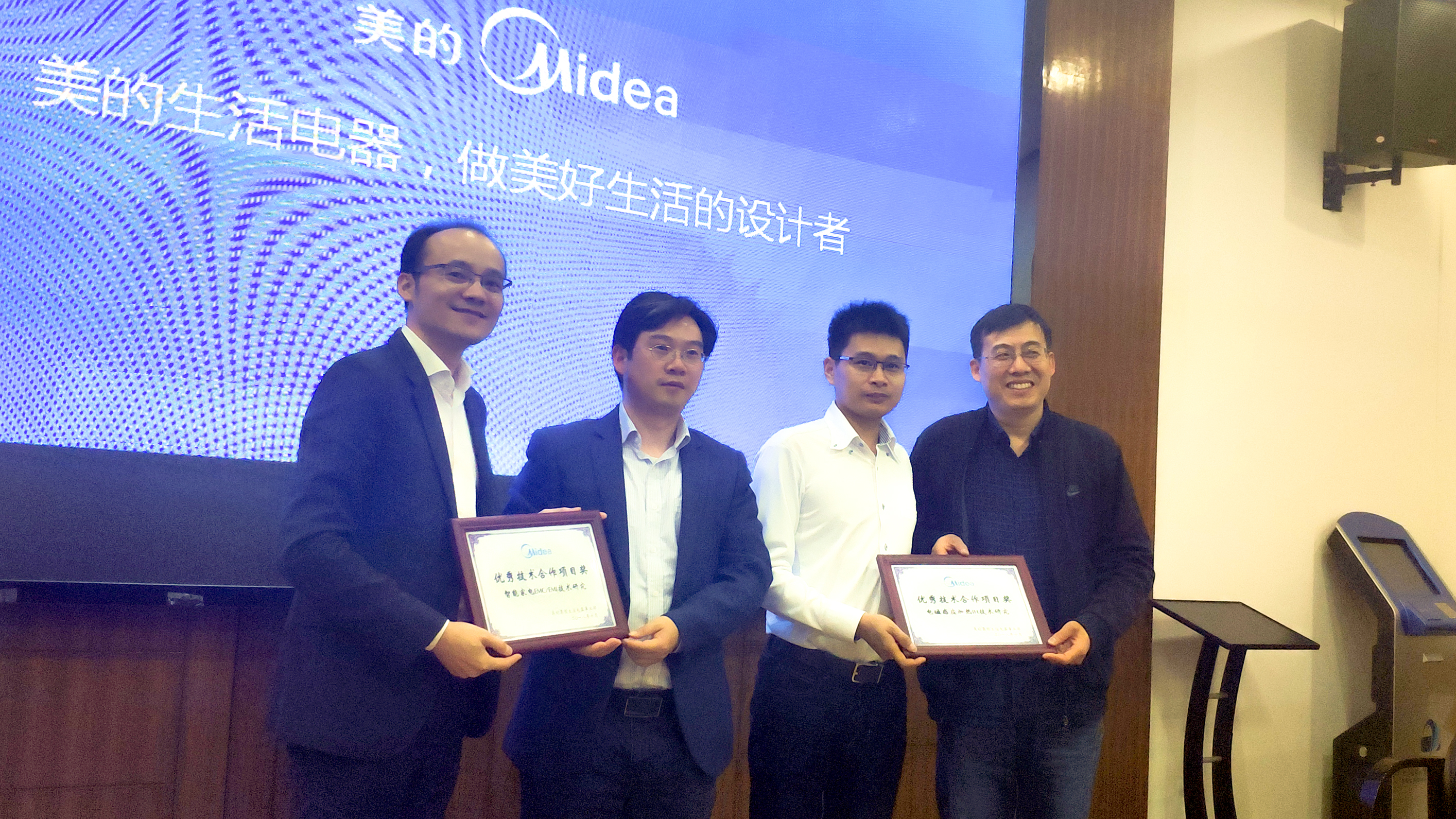 廖桂生经理和陈炜杰经理分别代表双方签署了联合实验室合作协议。李建东副董事长与黄兵副总经理代表双方为联合实验室揭牌,宣布了银河集团官网-美的生活电器电磁联合实验室的正式成立。同时美的生活电器事业部也对此前的优秀合作项目奖进行了颁奖表彰。