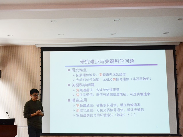 会上,首先由龚晨教授作了题为“无线光弱信号特性研究”的报告。他结合无线光通信以上两个信道信号特点,给出了宽光谱关联特性以及弱信号下的“非线性、非加性、非高斯、双随机性”的信号刻画。