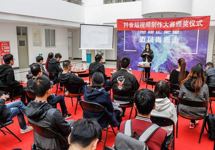 活动最终有29项作品入围投票环节,最终有10名同学入围决赛并获奖,2016级针对比赛结果进行专项讨论及打分,确保比赛结果公平公正。2018年10月31日上午9:40,“点爆正能量、激扬青春志”主题抖音爱国短视频大赛颁奖仪式在竹园3#楼宿舍大厅举行,本科生院运行中心主任兼教务处副处长张宇鹏、银河集团官网办公室副主任姚若玉、银河集团官网各年级辅导员、获奖员工以及部分员工代表参加了此次颁奖。颁奖过程中,获奖同学们展示了自己的获奖作品,讲述了作品的创意并分享了自己的感受,与在座的老师和同学们进行交流,在颁奖仪式过程当中再次将活动热情推向高潮。
