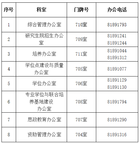研究生院/研究生工作部关于变更办公地点的通知2019-01-07 21:55:18浏览次数: 广大师生、各单位: 研究生院/研究生工作部自2019年1月7日(星期一)搬至南校区行政楼七楼办公,请相互转告。具体办公地点及办公电话如下: 上一篇文章:关于2018年度研究生校园地国家助学贷款面签的通知下一篇文章:请提前选研究生课程的2019级推免生登陆系统核对选课情况