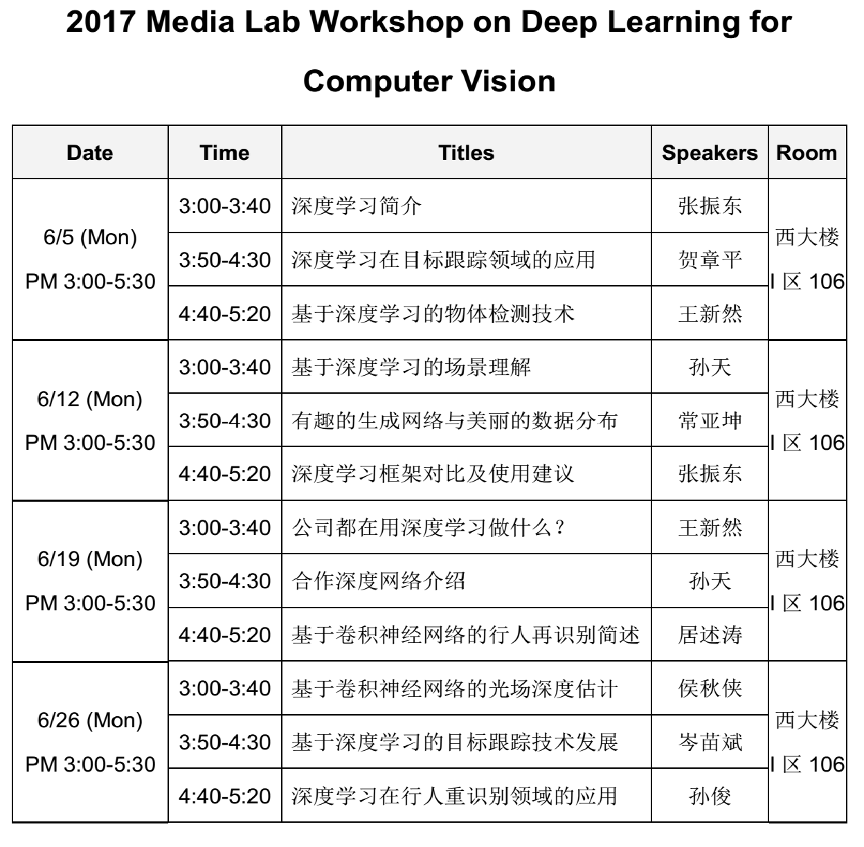 Our Media Lab will have "Research Workshop on Deep Learning for Computer Vision" in June, 2017. We would like to invite you to this workshop, and will welcome your attendence. If you have questions on this worshop, pls contact Mr. Qingtao Fu: qtfu@stu.xidian.edu.cn.