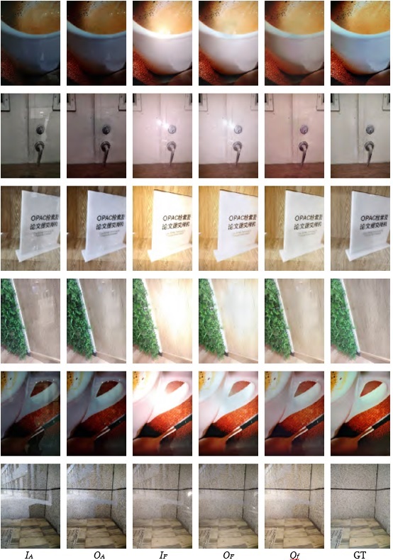 Left to right: Input no-flash image, output OA, input flash image, output OF , our final output Of and ground truth.