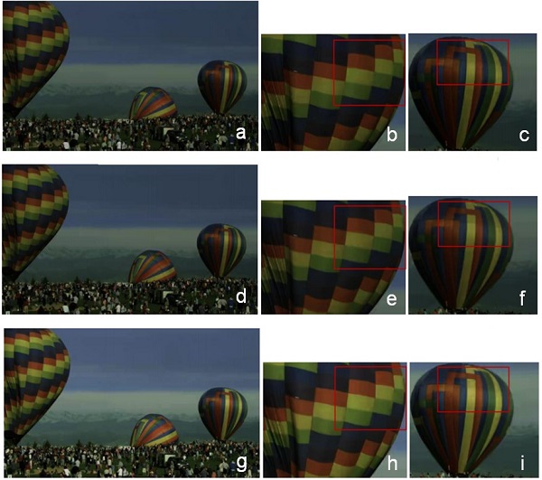 Fig. 1 Visual quality comparison in Balloon. (a) The reconstructed HDR frame by Anchor. (b), (c) Enlarged regions of (a). (d) The reconstructed HDR frame by [13]. (e), (f) Enlarged regions of (d). (g) The reconstructed HDR frame by the proposed method. (h), (i) Enlarged regions of (g).
